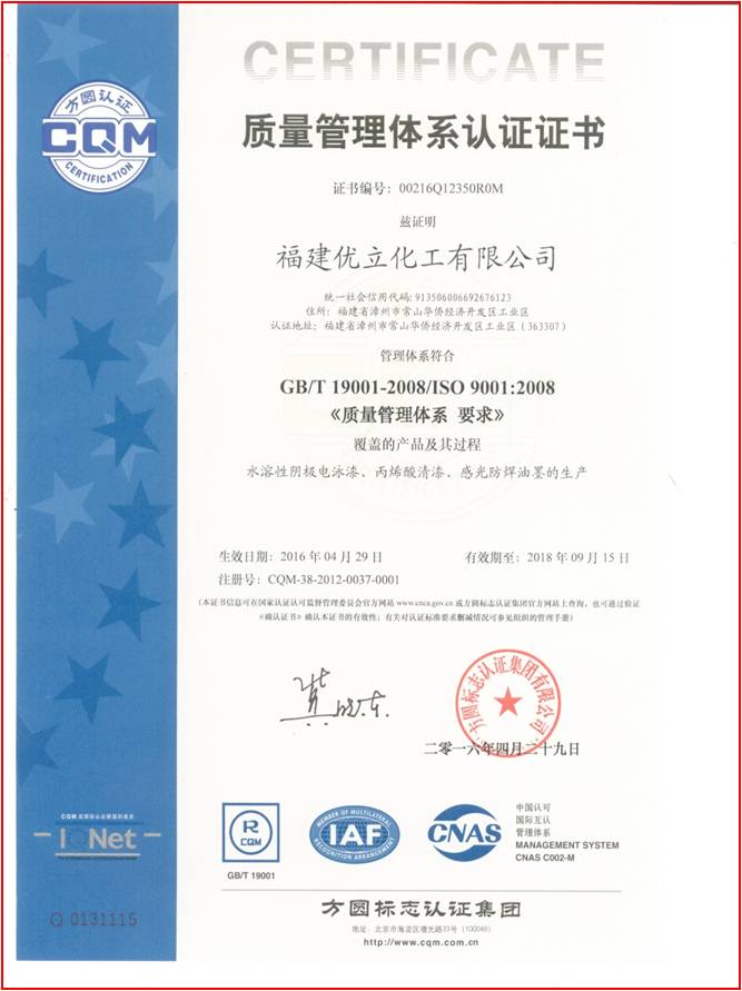 质量管理:福建优立通过ISO 9001:2008质量认证管理体系,油性透明漆并通过质量安全QS认证。生产采用全自动化式计算机管理系统,保证品质符合客户要求。